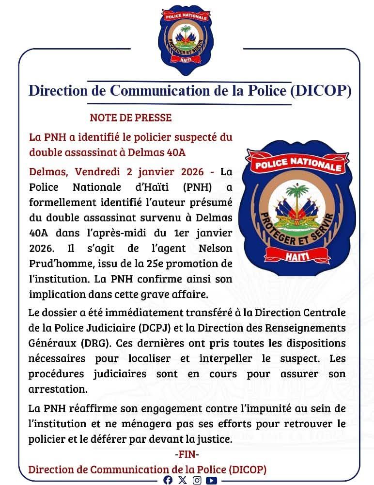 La Police nationale d’Haïti (PNH) a annoncé, dans un communiqué daté du 2 janvier 2026, avoir identifié l’auteur présumé d’un double assassinat survenu la veille à Delmas 40A. Selon la note de presse, il s’agit de l’agent Nelson Prud’homme, issu de la 25ᵉ promotion de la PNH. L’institution confirme de manière formelle l’implication du suspect dans le double meurtre, tout en précisant que, à ce stade, nul n’a fait l’objet d’aucune inculpation formelle. Le communiqué souligne que l’agent Prud’homme est activement recherché par les autorités.
